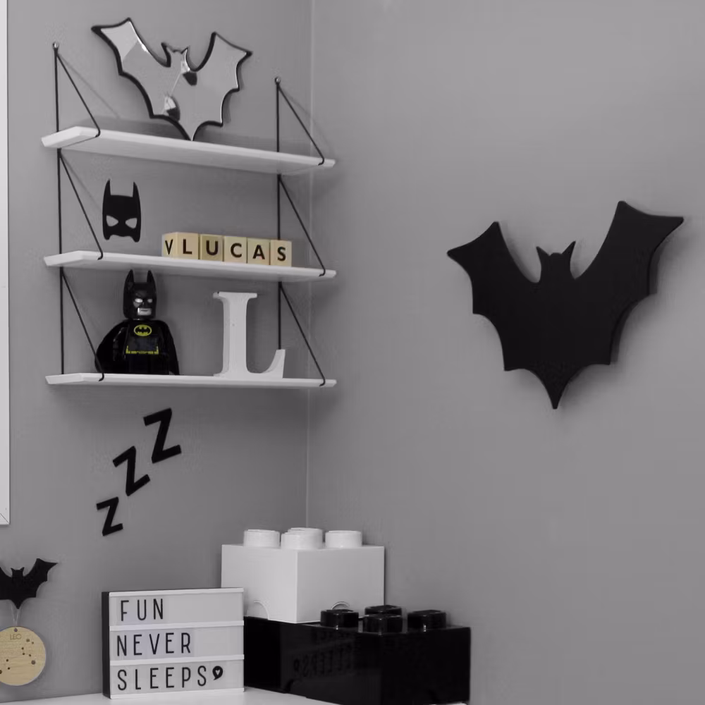 Gi barnerommet et koselig og stemningsfullt lys med Flaggermus Lampe i svart fra Maseliving. Denne sjarmerende lampen skaper den perfekte atmosfæren, enten det er til lesestunden, som nattlampe, eller ved stellebordet. Lampen har en praktisk avskjerming som demper belysningen, noe som gjør den ideell som nattlys for små barn. Med to lysnivåer og automatisk avstenging etter én time, er denne lampen både praktisk og trygg.