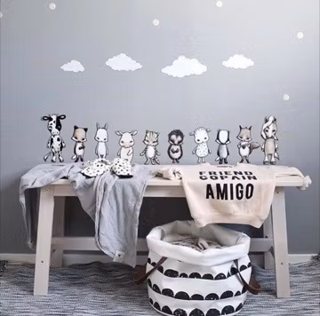 Sett med søte wallstickers i vinyl, inkludert rev, kanin, pinnsvin og mer. Enkel å flytte uten å skade veggen. Perfekt for barnerommet.
