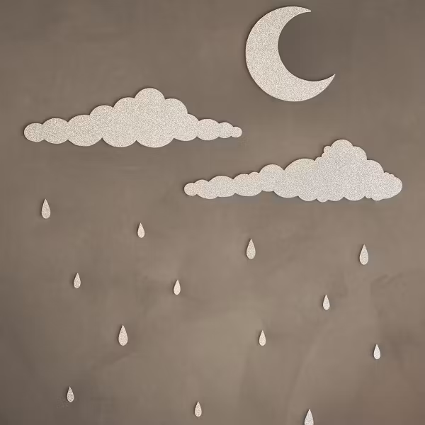 Skap en drømmende atmosfære på barnerommet med Rainy Days Veggdekor. Skyer, måne og regndråper gir et unikt preg. Enkel å montere, perfekt dekor!