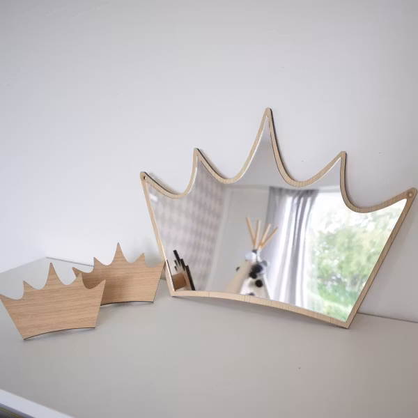 Legg til et lekent preg på barnerommet med Speil Krone fra Maseliving. Håndlaget akrylspeil i eik, perfekt for småbarn ved stellebordet. Unik og trygg design.