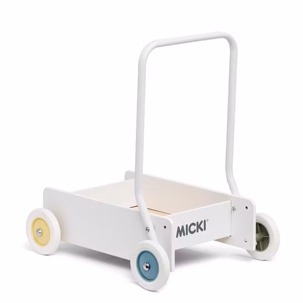 Oppdag Micki Gåvogn i duse pastellfarger. Justerbart håndtak, bremsbare hjul og plass til leker. Perfekt for balanse- og gåtrening. Kjøp nå og støtt barnets utv